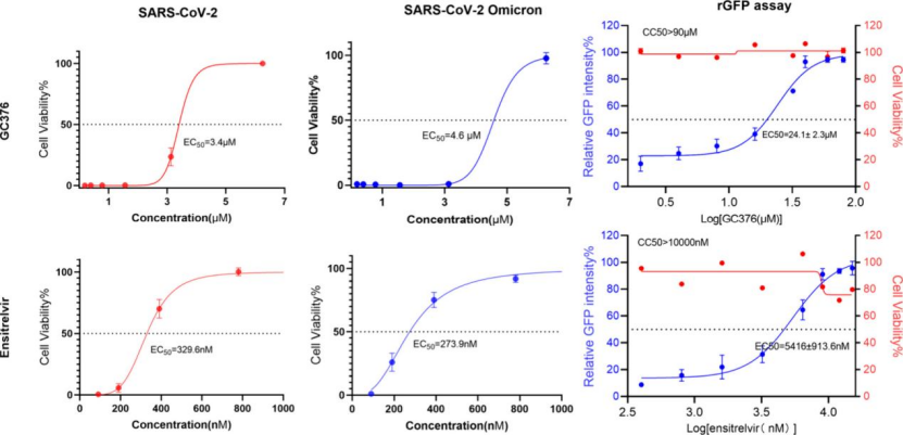 图2. 活病毒检测与rGFP15-3CLpro检测的半数有效浓度对比