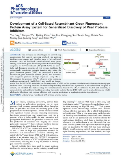 Yan Feng,Xiaoyan Wu,Ruiting Chen.et al.Development of a Cell-Based Recombinant Green Fluorescent Protein Assay System for Generalized Discovery of Viral Protease Inhibitors.ACS Pharmacology & Translational Science.2025/10/09.