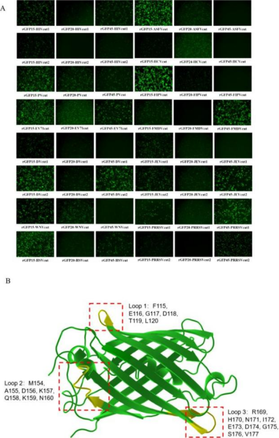 传统病毒蛋白酶抑制剂筛选方法长期面临两大难题:非细胞水平筛选缺乏体内相关性,而活病毒筛选则存在生物安全风险高、通量低等局限。迪福润丝研发团队通过对绿色荧光蛋白(GFP)结构的深入探索,成功鉴定了三个高度柔性区域​(E116~L120、M154~N160、H170~V177),这些区域能够容纳外源蛋白酶切割序列而不影响荧光表达,为广谱抑制剂筛选奠定了坚实基础。